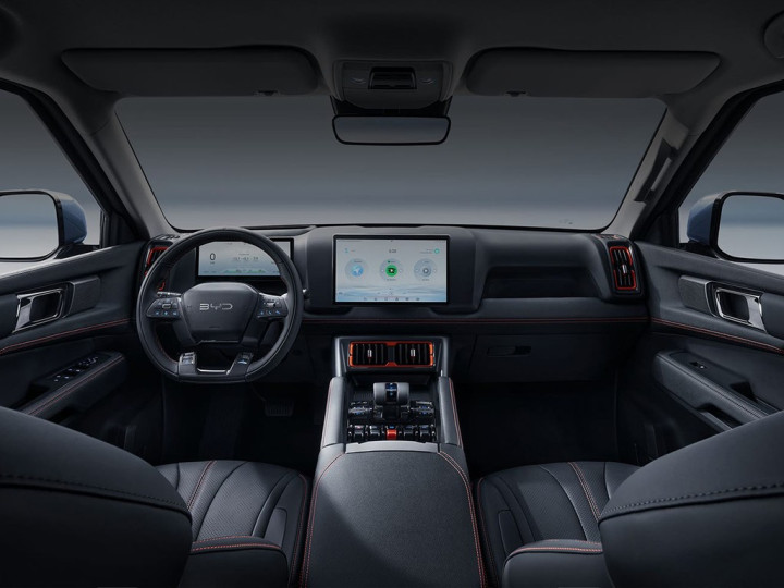而进入到车内,新车也依旧保留着比亚迪经典的可旋转式12.8英寸中控屏,内置智能语音、540度全景影像以及唱吧等功能。另外,新车还可支持Apple CarPlay/Andriod Auto手机互联。四辐式方向盘前方配备10.25英寸液晶仪表,并且还提供12英寸W-HUD抬头显示屏。