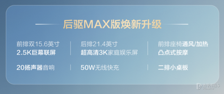 在配置方面,新车将会配备可移动的中岛、手机无线充电面板、容积10升的车载冰箱、前两排座椅配备通风、加热、8点式按摩功能,后排小桌板、后排21.4英寸3K吸顶屏等。